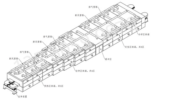 在橫拉設(shè)備中烘箱主要為薄膜預(yù)熱、拉伸、定型、冷卻過(guò)程中提供一個(gè)密閉保溫的空間,并且烘箱內(nèi)部按區(qū)域功能及一定間距為由隔斷板間隔開。
